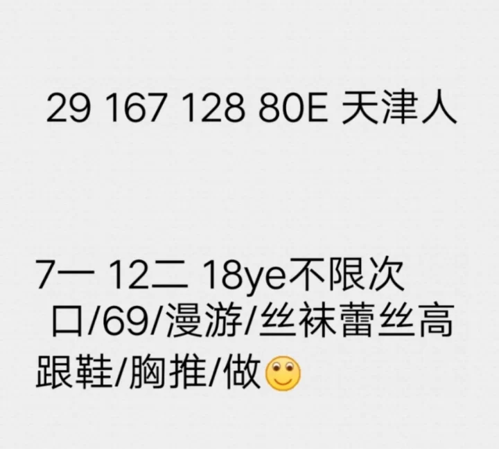 信息分类:楼凤兼职 地区:天津-市区 信息来源:qq群 小姐数量:1 小姐年龄:29 小姐素质:奶真大,不机车,下面有照片,颜值不错,有点小贵 小姐外形:胸大,腿细 服务项目:下面有照片 营业时间:随时 环境设备:没啥 安全评估:租的房子,很安全 详细地址:本段信息已隐藏,请先登陆。点击登陆 , 或者 点击注册 联系方式(手机号/QQ/微信):本段信息已隐藏,请先登陆。点击登陆 , 或者 点击注册 综合评价:挺棒的,反正我挺喜欢的的 详细介绍: 挺漂亮的本市小姐姐,活还行,就是有点贵,最近她脚丫子崴了,肿的挺厉害的,可能这几天接不了客了。慎重选择 楼凤兼职