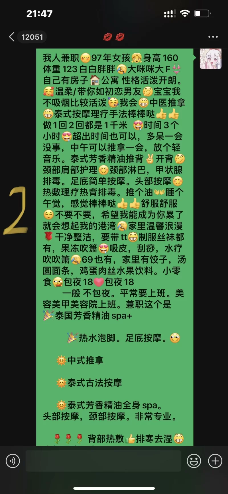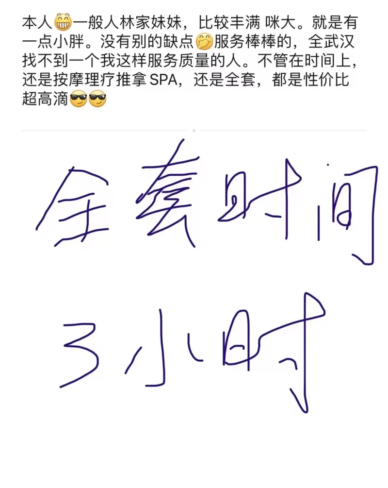 信息分类:楼凤兼职 地区:湖北省-武汉 信息来源:朋友 年龄:27 颜值身材:8 服务项目:水床按摩Spa kj dl aa 价格:1000 环境设备:9 详细地址:本段信息已隐藏,请先登陆。点击登陆 , 或者 点击注册 联系方式(微信):本段信息已隐藏,请先登陆。点击登陆 , 或者 点击注册 详细介绍: 妹子做按摩的,出来兼职,全程3个小时服务满满当当,先是水床推拿,然后擦拭上床上精油开背,kj,dl一系列做完开始aa,中途休息又开始全身按摩,然后第二发,最后再足底洗脚按摩,爽歪歪 楼凤兼职